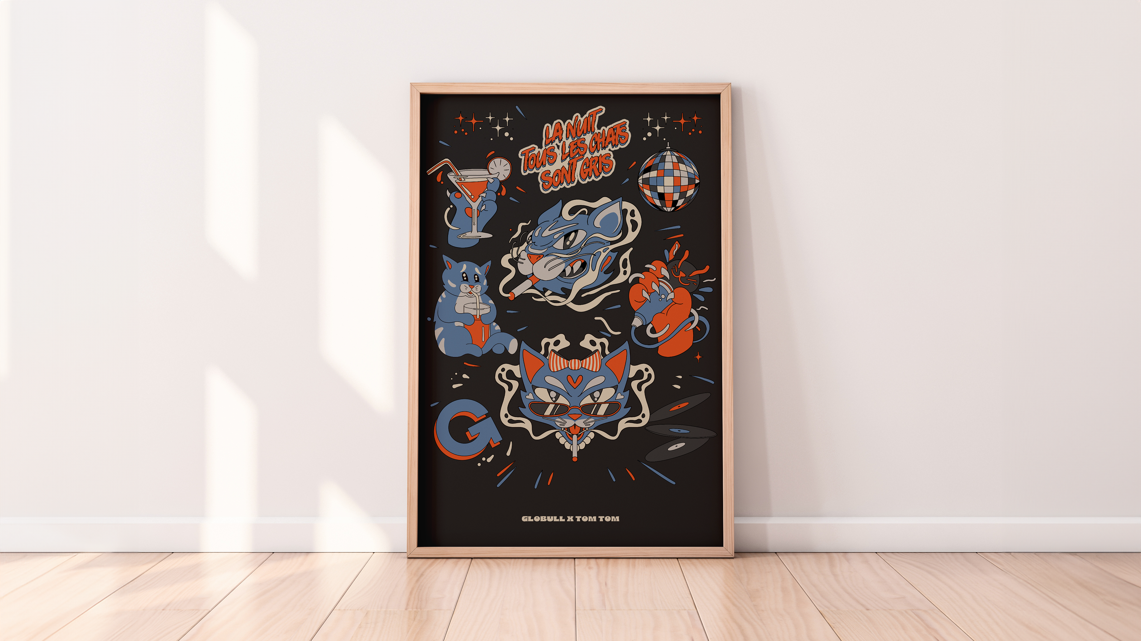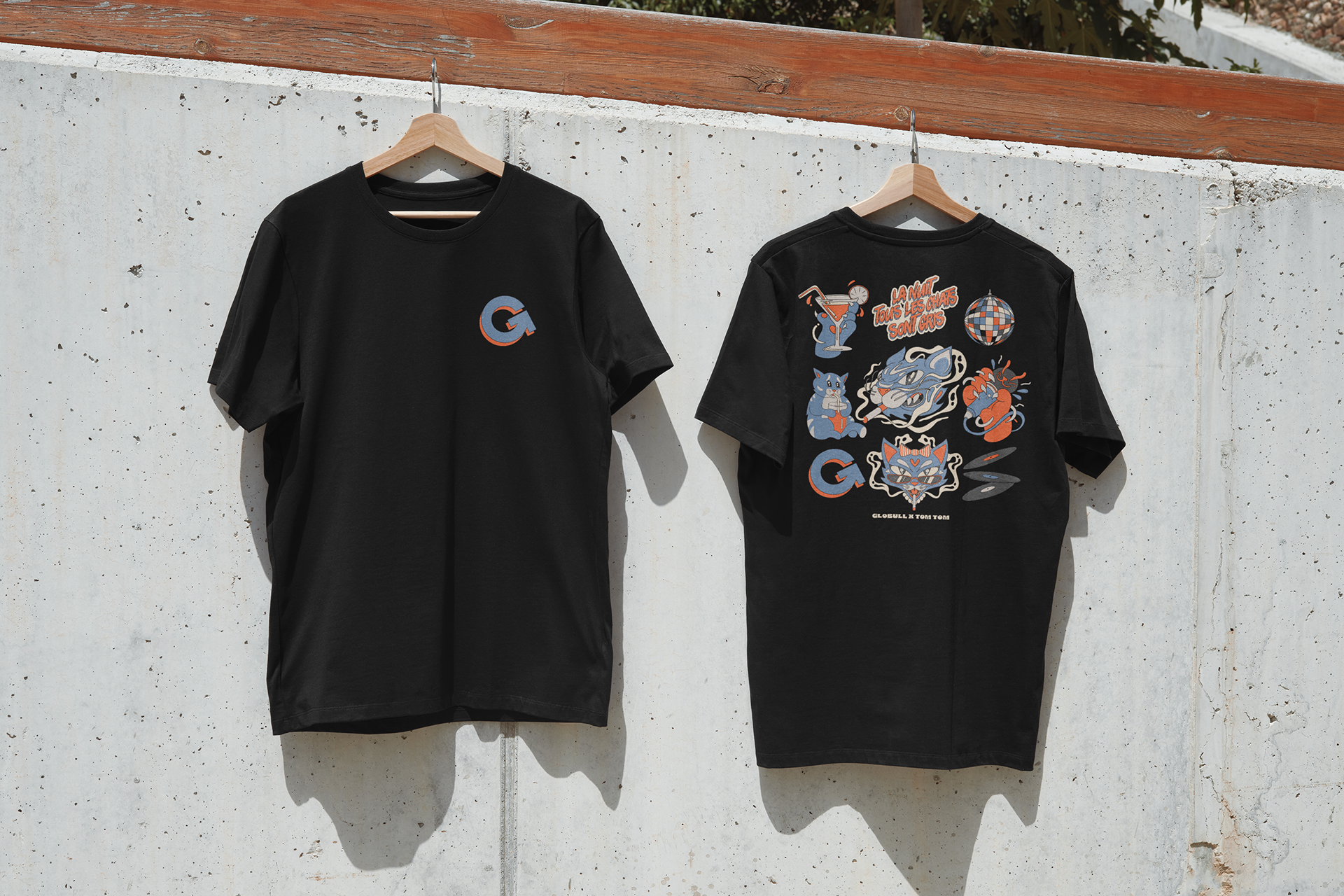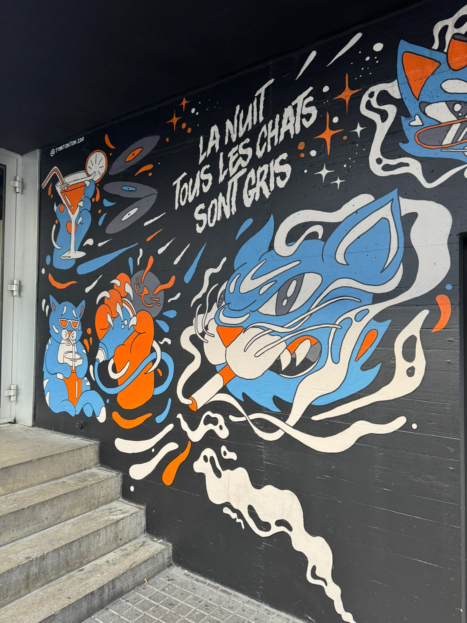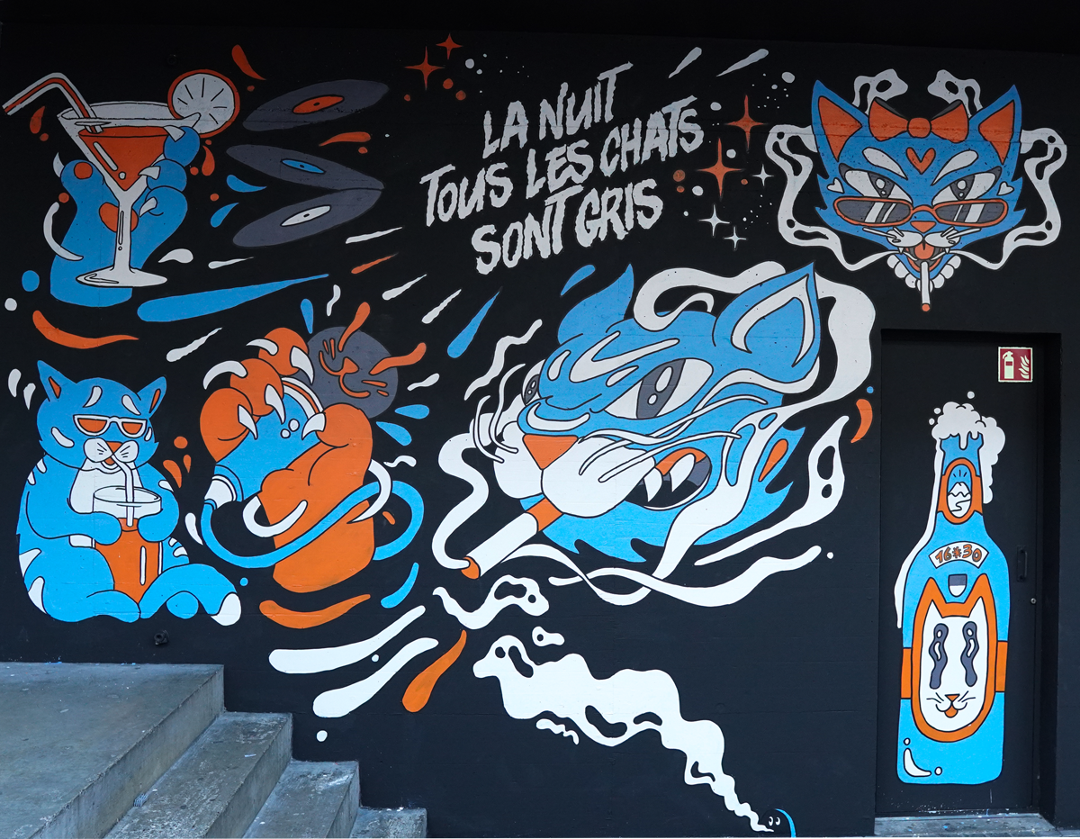 Conçue spécifiquement pour le fumoir extérieur, la fresque dialogue avec l’architecture du lieu et l’expérience des noctambules. Elle apporte une identité visuelle forte, reconnaissable et mémorable, tout en renforçant l’univers artistique du Globull.